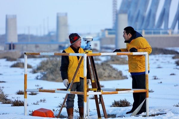 馮兵與同事現(xiàn)場研究圖紙,討論施工方案
