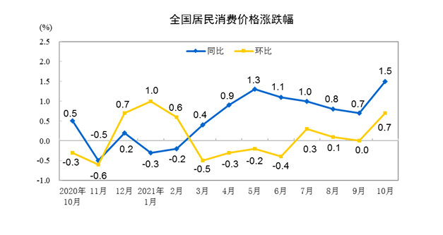 國(guó)家統(tǒng)計(jì)局10日發(fā)布數(shù)據(jù),10月份,全國(guó)居民消費(fèi)價(jià)格指數(shù)(CPI)同比上漲1.5%,漲幅雖比上月擴(kuò)大0.8個(gè)百分點(diǎn),但仍低于宏觀調(diào)控預(yù)期目標(biāo),消費(fèi)市場(chǎng)供需基本平穩(wěn)。