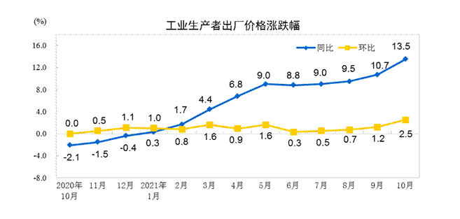 專家分析,部分食品和工業(yè)消費(fèi)品價(jià)格漲幅擴(kuò)大,顯示大宗商品價(jià)格上漲壓力正向部分終端消費(fèi)品傳導(dǎo)。據(jù)統(tǒng)計(jì),受國(guó)際輸入性因素疊加國(guó)內(nèi)主要能源和原材料供應(yīng)偏緊影響,10月份,全國(guó)工業(yè)生產(chǎn)者出廠價(jià)格指數(shù)(PPI)同比上漲13.5%,漲幅比上月擴(kuò)大2.8個(gè)百分點(diǎn)。