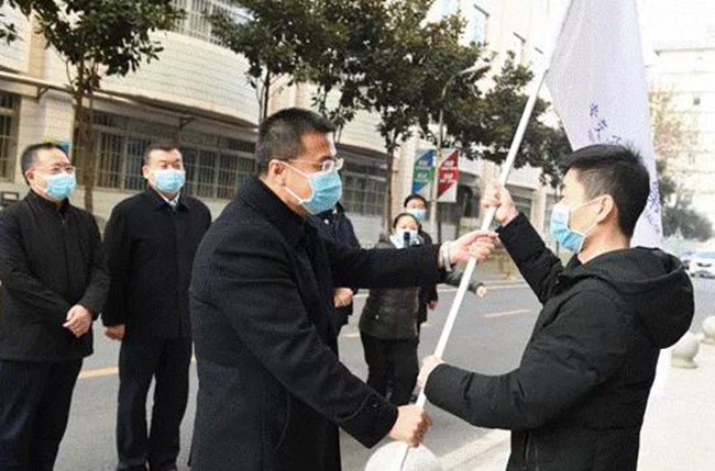 白曉旭從院黨委副書記馮廣林手里接過(guò)隊(duì)旗。西安交大第一附屬醫(yī)院供圖