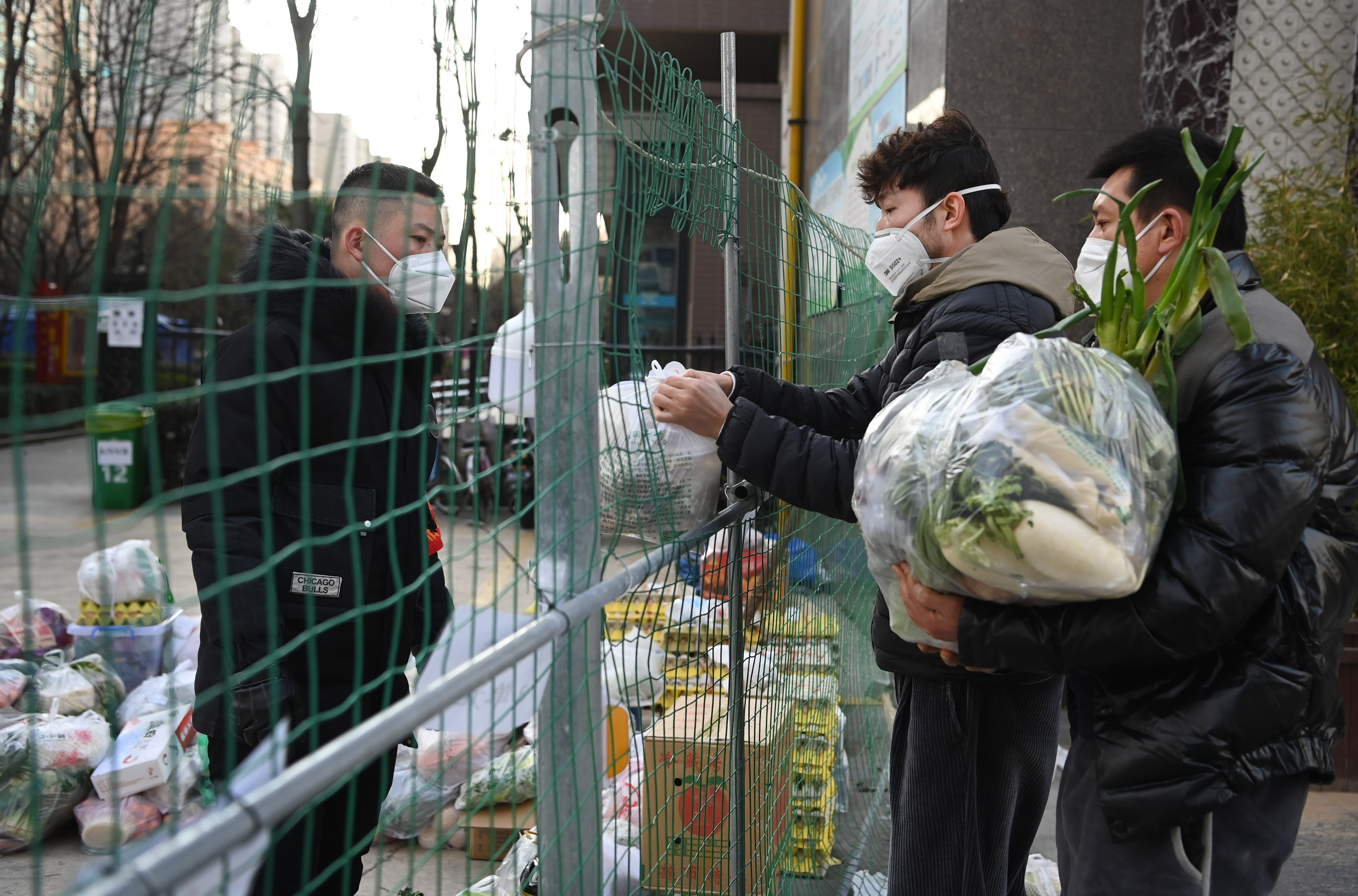 1月12日,志愿者(左)在社區(qū)門前小廣場接收居民線上購買的生活物資。新華社記者 陶明 攝