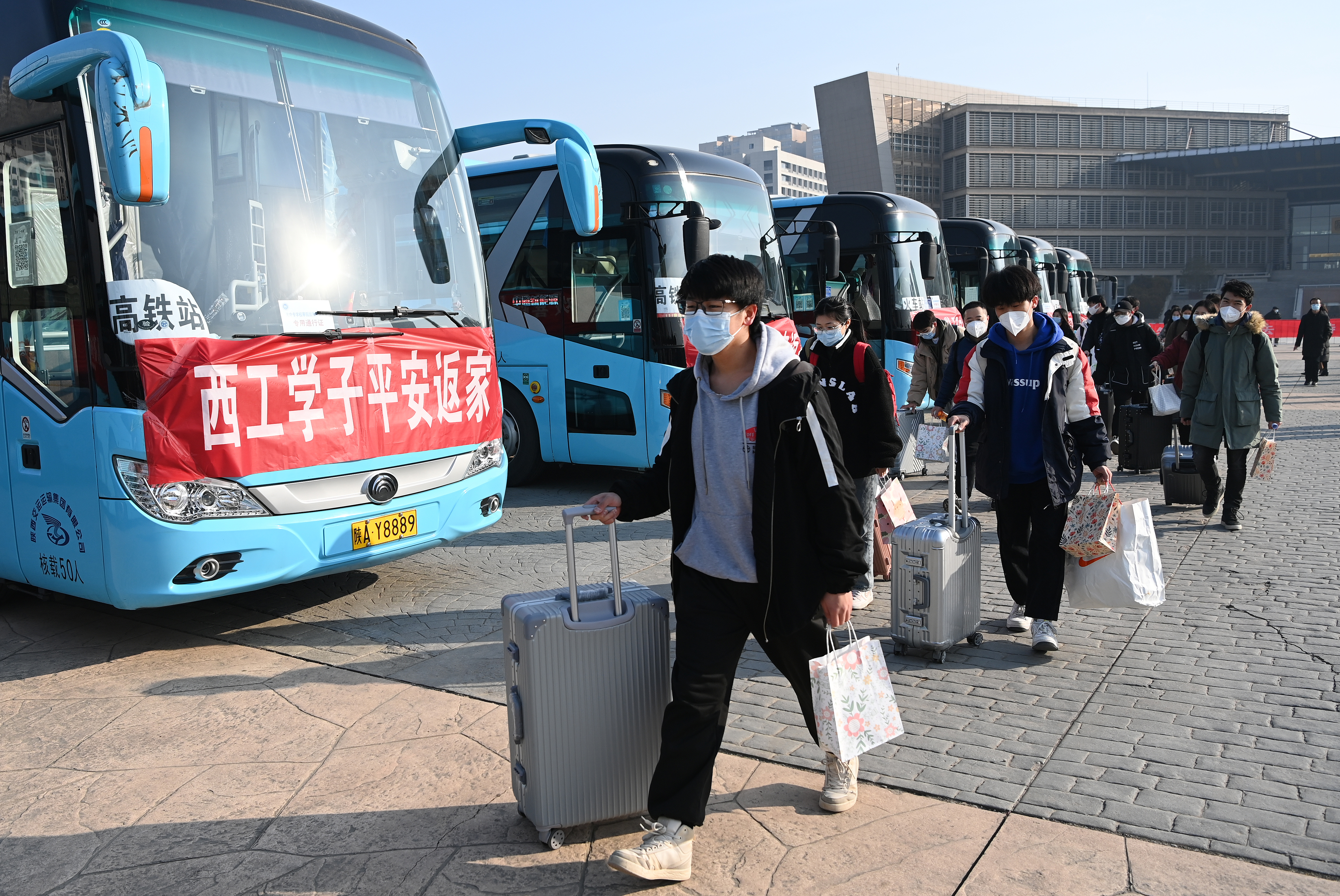 1月16日,西安工業(yè)大學未央校區(qū)的學生準備乘坐統(tǒng)一安排的大巴前往車站。