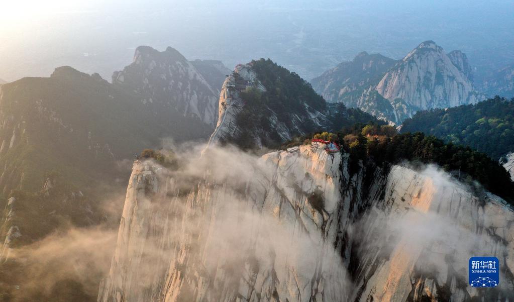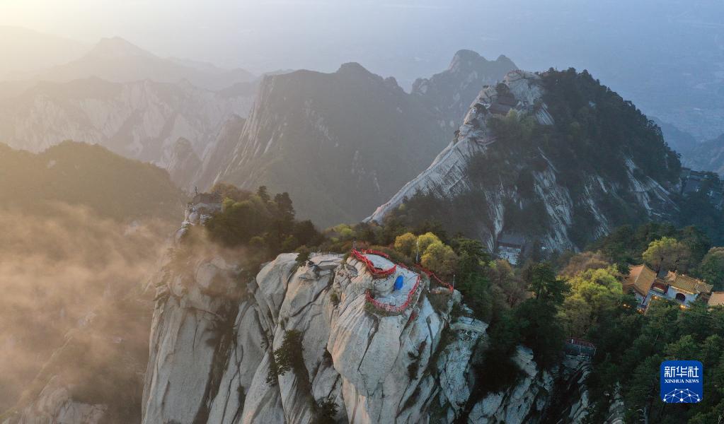 夕陽(yáng)下的華山(4月28日攝,無(wú)人機(jī)照片)。新華社記者陶明攝