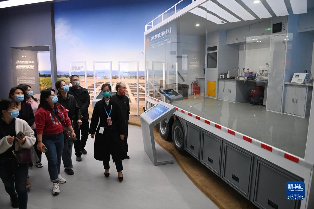 4月28日,游客在陜西考古博物館內(nèi)參觀考古現(xiàn)場文物保護(hù)移動(dòng)實(shí)驗(yàn)室。新華社記者 李一博 攝