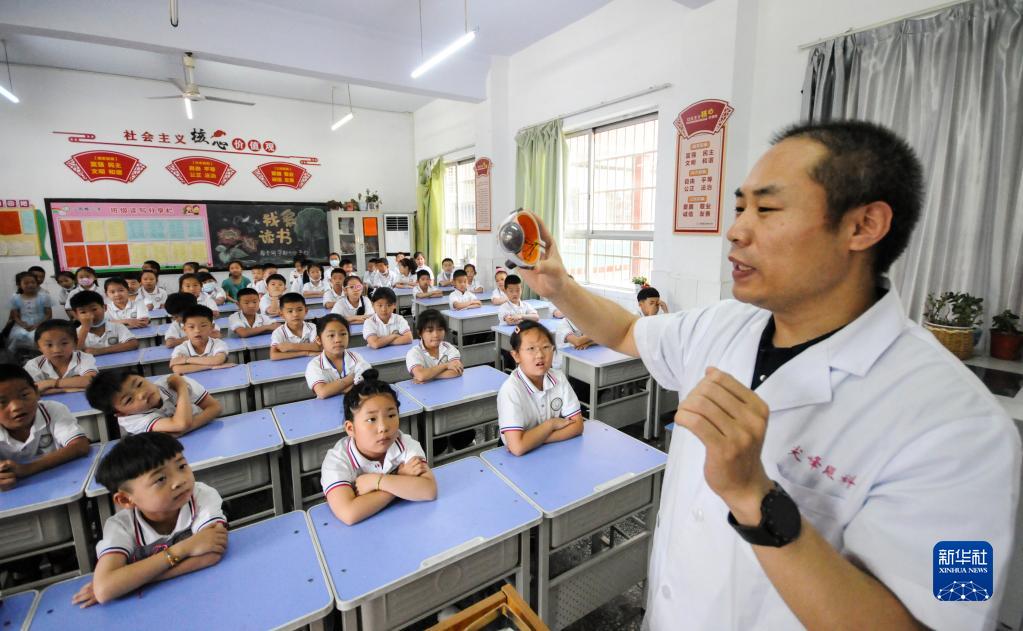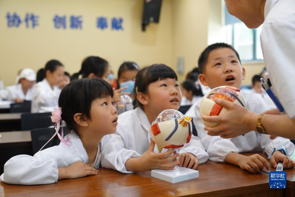 6月5日,在重慶市北碚區(qū)一家眼科醫(yī)院,一名驗光師在給孩子們講解眼球構造知識。新華社發(fā)(秦廷富 攝)