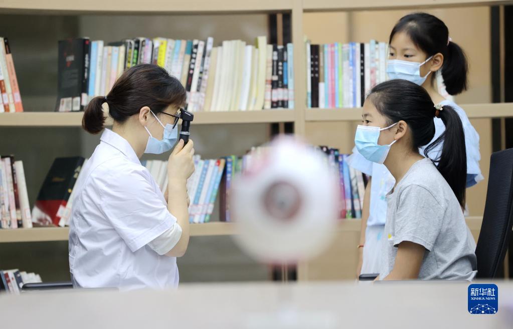 6月5日,在浙江省湖州市德清縣武康街道新豐未來社區(qū),醫(yī)務人員為社區(qū)兒童檢查視力。新華社發(fā)(謝尚國 攝)