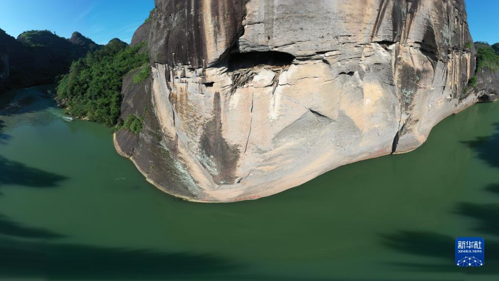 武夷山九曲溪畔丹霞石壁上的架壑船棺(6月6日攝,無人機照片)。架壑船棺和虹橋板是當?shù)毓砰}族的葬俗遺跡。新華社記者 姜克紅 攝