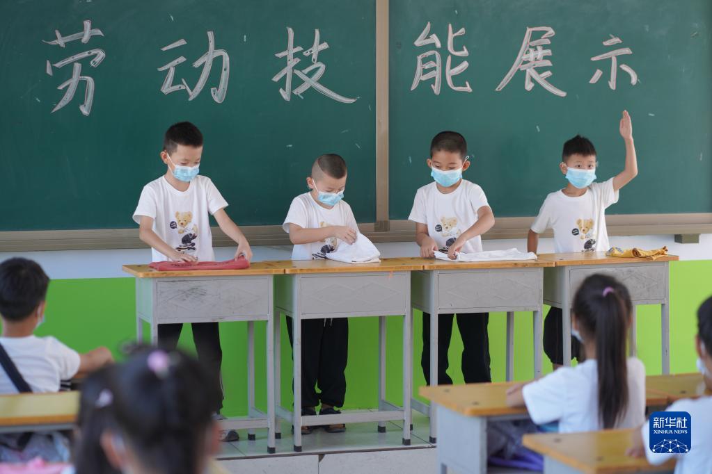 9月1日,河北省邢臺市內(nèi)丘縣西陽小學學生在開學第一課上比拼勞動技能。新華社發(fā)(劉繼東 攝)