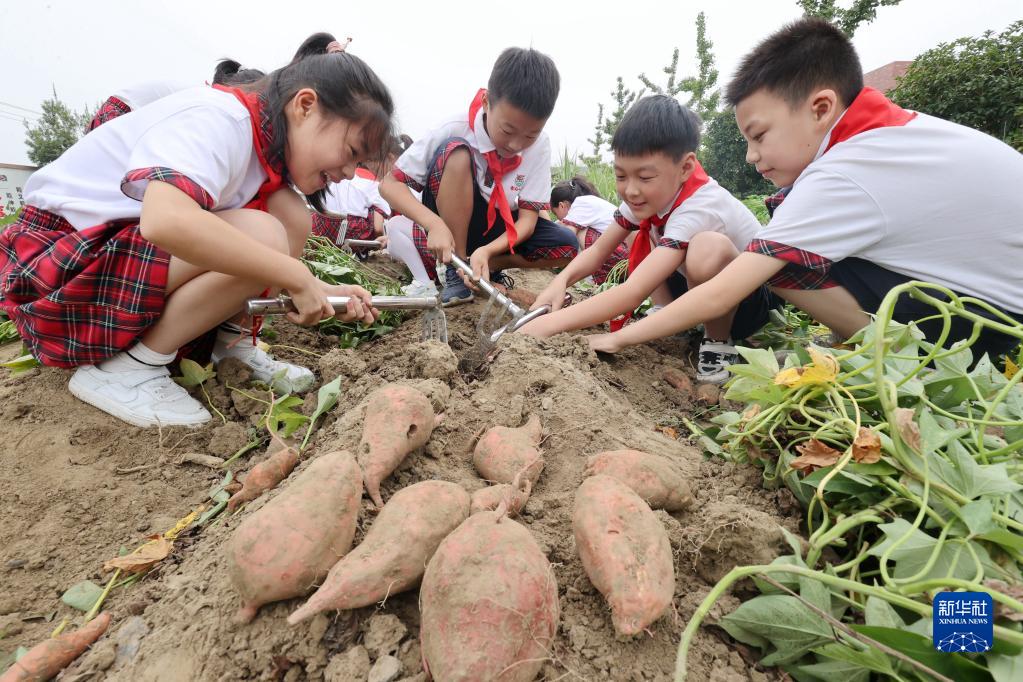 9月1日,浙江省湖州市德清縣雷甸鎮(zhèn)中心小學學生在校園農(nóng)場挖番薯。新華社發(fā)(謝尚國 攝)