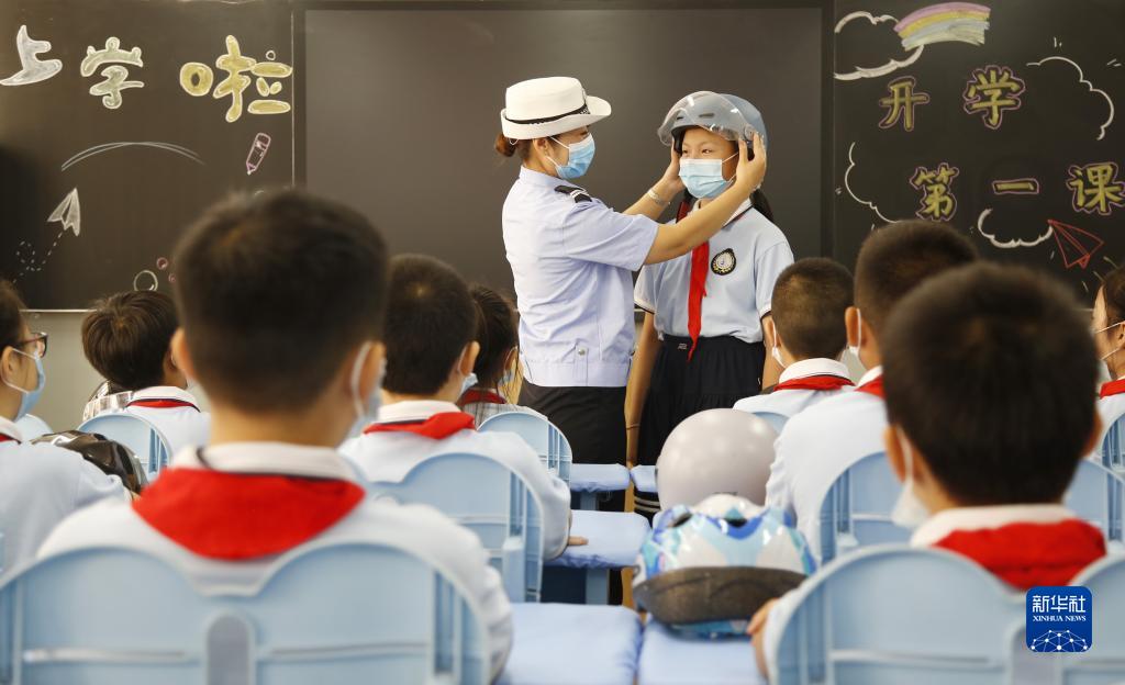 9月1日,在河北省邢臺市逸夫小學,交通民警給學生上交通安全課。新華社發(fā)(張馳 攝)