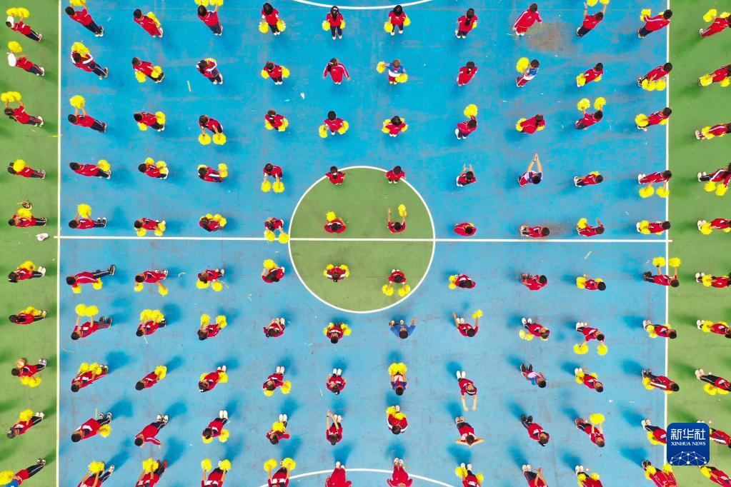 9月1日,貴州省貴陽市開陽縣第一小學學生在跳自編舞《天天向上》(無人機照片)。新華社發(fā)(袁福洪 攝)