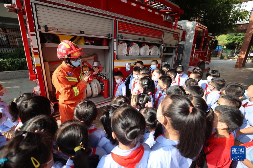9月1日,在福建省廈門市金安小學,消防員向小學生們講解消防器材裝備的使用方法。新華社發(fā)(曾德猛 攝)