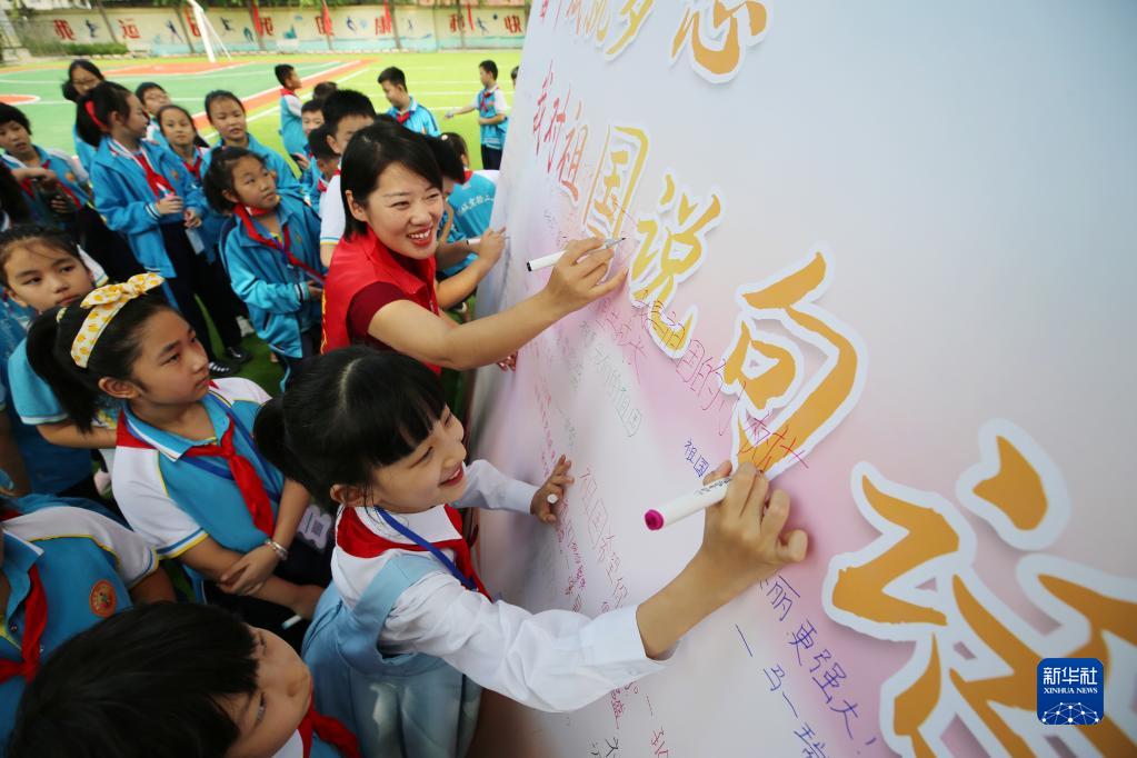 9月1日,山東省郯城縣郯城街道龍泉社區(qū)工作者與小學生一起寫下對祖國的祝福語。新華社發(fā)(張春雷 攝)