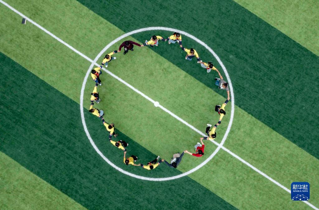 9月1日,貴州省黔西市定新小學學生在操場上做游戲(無人機照片)。新華社發(fā)(范暉 攝)