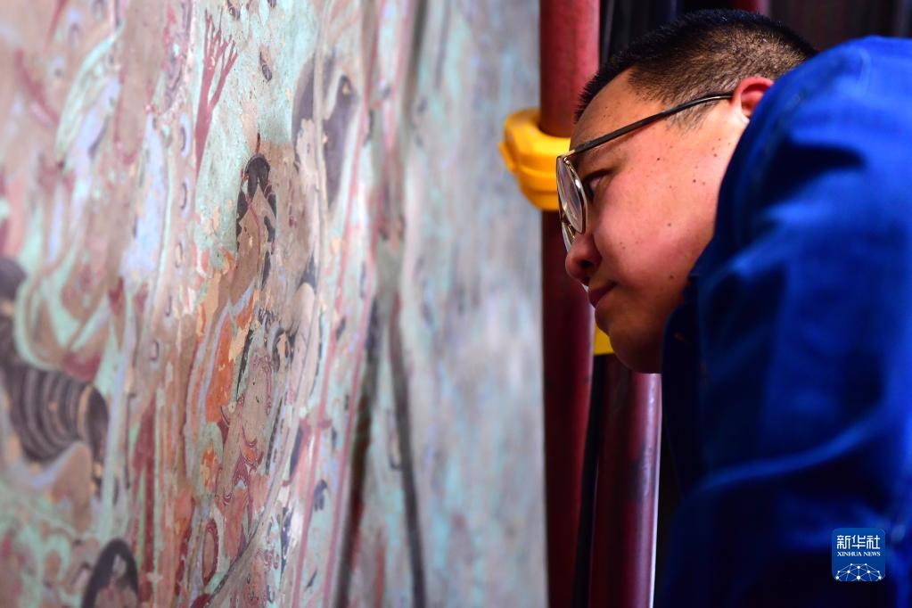 在莫高窟第231窟,敦煌研究院文物保護技術(shù)服務(wù)中心的壁畫修復(fù)工作者在修復(fù)出現(xiàn)病害的壁畫(2022年4月19日攝)。新華社記者 杜哲宇 攝
