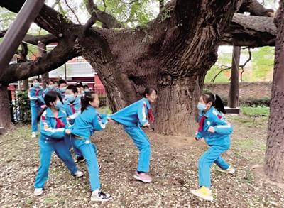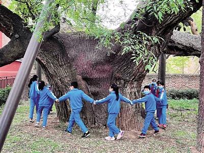 放學(xué)鈴聲響起,同學(xué)們排著隊,有序從學(xué)校走出。“這棵古樹,到了夏天,伸展出的枝葉,可以覆蓋大部分校園,同學(xué)們在大樹的懷抱下,避開烈日,享受課間自由活動時間。”李以萱說著,召喚12名同學(xué),大家手拉手環(huán)繞在“護(hù)王槐”主干周圍,玩起了老鷹捉小雞,唱著《上學(xué)歌》。