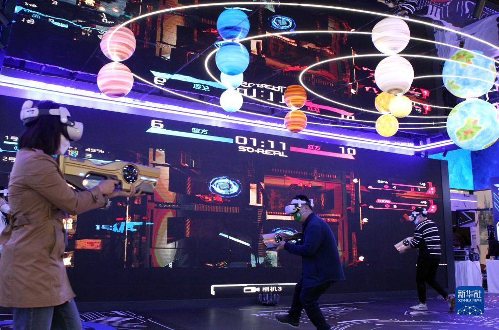 11月7日,在第五屆進(jìn)博會(huì)技術(shù)裝備展區(qū)的人工智能專區(qū),體驗(yàn)者借助VR設(shè)備進(jìn)行電競(jìng)互動(dòng)游戲。新華社記者 侯俊 攝