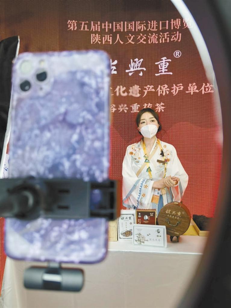 進(jìn)博會期間,身著古裝的工作人員為裕興重茯茶進(jìn)行直播帶貨。