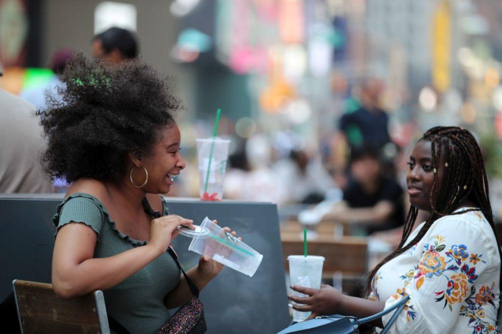 2018年7月2日,在美國紐約市時報廣場,人們喝水休息。(新華社記者王迎攝)