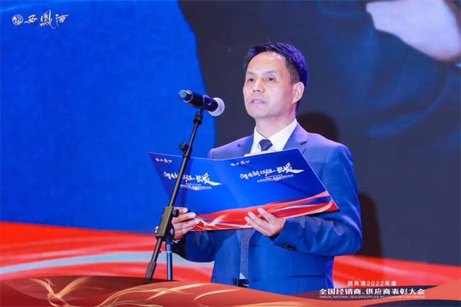 西鳳集團(tuán)公司黨委副書記郭拴新致祝酒辭,感謝參會經(jīng)銷商和一直以來給予西鳳大力支持的各界朋友,希望與大家攜手共進(jìn)、并肩同行,共同開創(chuàng)西鳳事業(yè)高質(zhì)量發(fā)展的絢麗篇章。