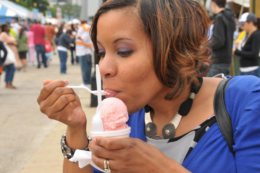 2011年6月24日,在美國(guó)芝加哥美食節(jié)上,一名女子品嘗冰激凌。新華社發(fā)(蔣新彤?dāng)z)