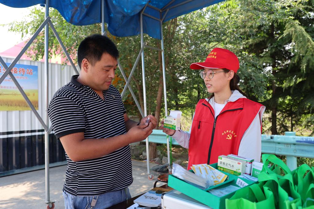 在G4京港澳高速邢臺北口,跨區(qū)機收接待服務站工作人員向農(nóng)機手發(fā)放防暑物品。新華社記者 鄒尚伯 攝