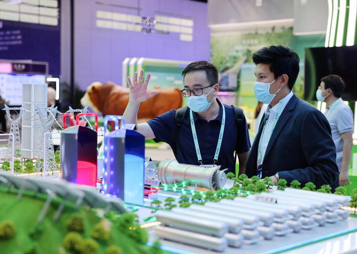 5月26日,觀眾在在中關(guān)村國家自主創(chuàng)新示范區(qū)展示中心了解100MW先進(jìn)壓縮空氣儲能技術(shù)。新華社記者 張晨霖 攝