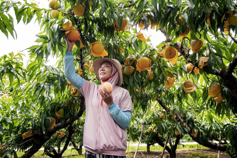 盛夏時節(jié),江蘇省無錫市惠山區(qū)陽山鎮(zhèn)的空氣中彌漫著香甜的味道。凌晨4點,桃源村村民姚文君已在果園開始一天的忙碌。暑氣蒸騰,老姚的汗衫濕了又干、干了再濕。