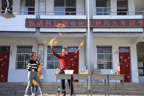 付佳樂(lè)與指導(dǎo)教師一起為丹鳳縣武關(guān)鎮(zhèn)北趙川九年制學(xué)校展示趣味科學(xué)實(shí)驗(yàn)。受訪(fǎng)者供圖