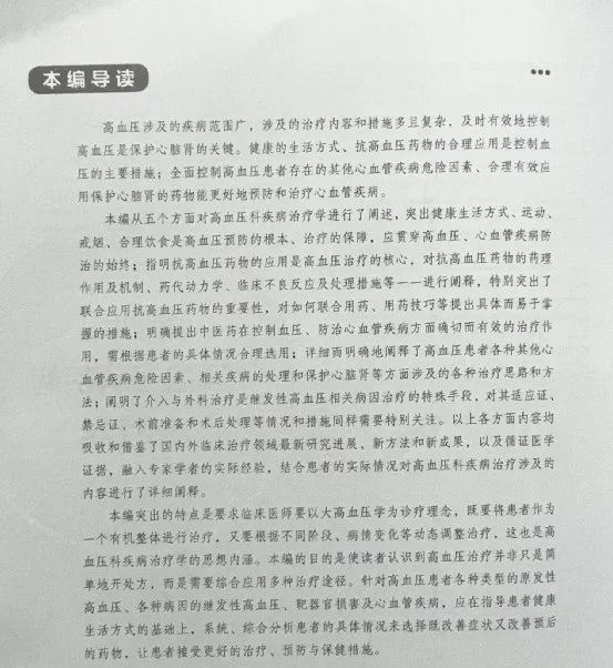 該書(shū)每一編都有一個(gè)導(dǎo)讀,指導(dǎo)讀者怎樣學(xué)習(xí)使用相關(guān)內(nèi)容,在閱讀每編、章、節(jié)前都能構(gòu)建好系統(tǒng)的理論知識(shí)框架,順利把握好各章節(jié)中的重點(diǎn)、難點(diǎn)及疑點(diǎn),更好地汲取書(shū)中的教學(xué)方法及研究成果。如第四編“高血壓科疾病治療學(xué)”從健康生活方式、抗高血壓藥物、中醫(yī)藥、相關(guān)疾病處理和介入與外科手術(shù)等五個(gè)方面對(duì)高血壓科疾病治療學(xué)進(jìn)行了闡述。反映了高血壓涉及的疾病范圍廣,涉及的治療內(nèi)容和措施多且復(fù)雜,及時(shí)有效地控制高血壓是保護(hù)心腦腎的關(guān)鍵。健康的生活方式、抗高血壓藥物的合理應(yīng)用是控制血壓的主要措施;全面控制高血壓患者存在的其他心血管疾病危險(xiǎn)因素、合理有效應(yīng)用保護(hù)心腦腎的藥物能更好地預(yù)防和治療心血管疾病。