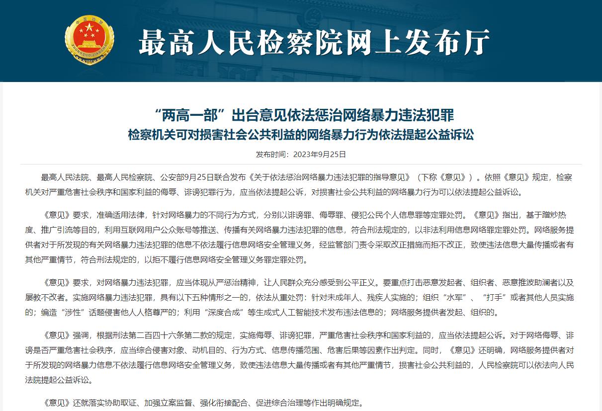 最高人民法院、最高人民檢察院、公安部9月25日聯(lián)合發(fā)布《關(guān)于依法懲治網(wǎng)絡(luò)暴力違法犯罪的指導(dǎo)意見(jiàn)》(下稱(chēng)《意見(jiàn)》)。依照《意見(jiàn)》規(guī)定,檢察機(jī)關(guān)對(duì)嚴(yán)重危害社會(huì)秩序和國(guó)家利益的侮辱、誹謗犯罪行為,應(yīng)當(dāng)依法提起公訴,對(duì)損害社會(huì)公共利益的網(wǎng)絡(luò)暴力行為可以依法提起公益訴訟。