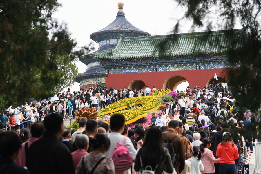 10月2日,游客在天壇公園內(nèi)排隊(duì)前往祈年殿參觀。新華社記者 鞠煥宗 攝