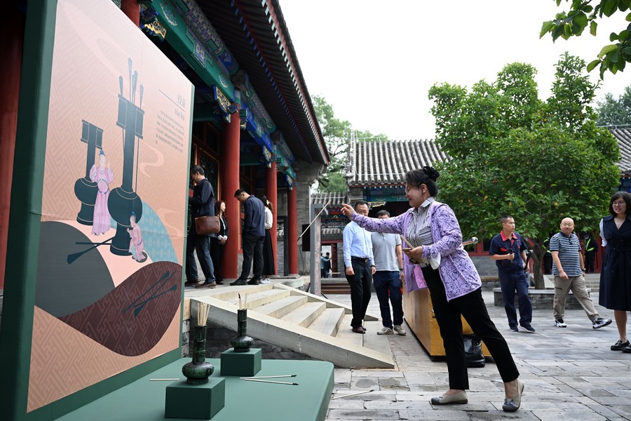 9月25日,在北京恭王府博物館一場(chǎng)展覽上,觀眾體驗(yàn)投壺。新華社記者 金良快 攝