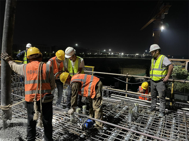 整個(gè)澆筑自10月15日下午4點(diǎn)44分開始,至10月16日早上7點(diǎn)30分結(jié)束,共用時(shí)14.77小時(shí),本次澆筑采用泵送加下料管入模、附著式平板振動(dòng)器加插入式振動(dòng)器相結(jié)合的施工工藝,澆筑混凝土共計(jì)305方。此次澆筑為后續(xù)連續(xù)梁施工奠定了良好的基礎(chǔ),標(biāo)志著跨京滬高鐵立交特大橋施工正式進(jìn)入控制性工程。