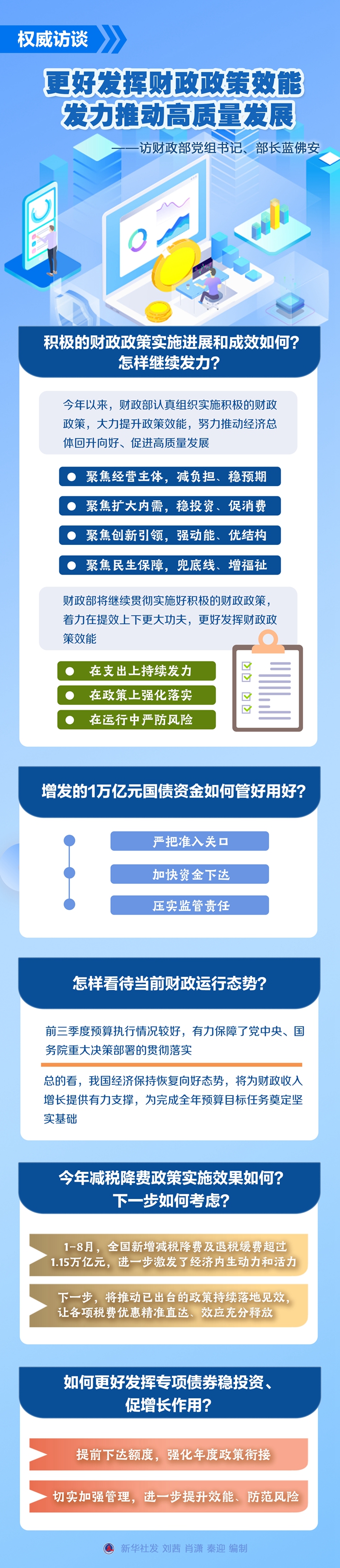 財(cái)政政策是國(guó)家宏觀調(diào)控的重要手段。下一步,財(cái)政政策還將如何發(fā)力?增發(fā)的國(guó)債怎樣用好?財(cái)政運(yùn)行態(tài)勢(shì)如何?新華社記者采訪了財(cái)政部黨組書(shū)記、部長(zhǎng)藍(lán)佛安。
