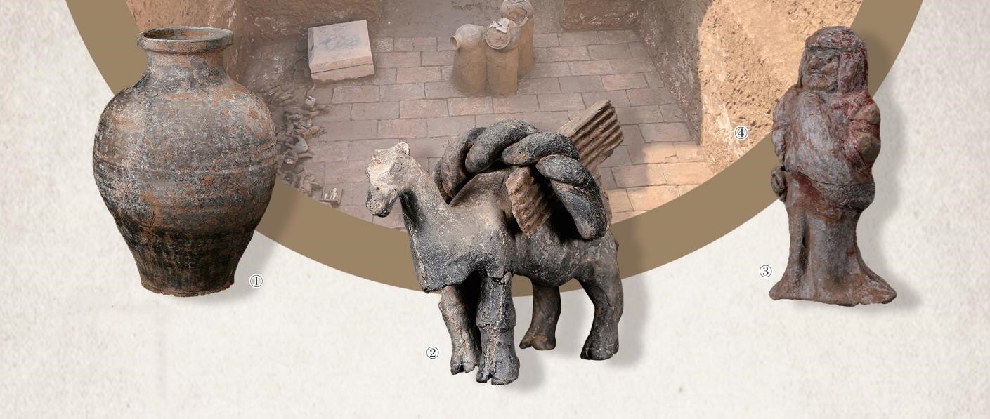 ①出土于北周宇文覺墓的陶罐(資料照片)。 ②出土于北周宇文覺墓的載物駱駝(資料照片)。 ③出土于北周宇文覺墓的持盾武士俑(資料照片)。 ④北周宇文覺墓M655墓室(資料照片)。 照片均為陜西省考古研究院供圖