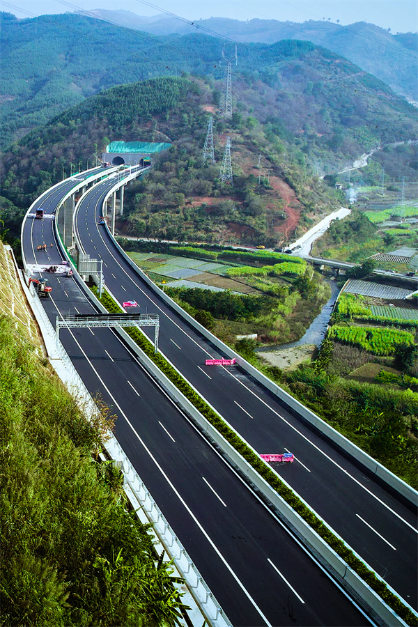 至此,起點于隆林縣平班鎮(zhèn)委樂村,由東向西途經(jīng)南希屯、南卡界屯、南隴屯,終點于隆林縣城東南側(cè)那他屯,雙向4車道、寬26米、行車速度每小時100公里,又是廣西高速公路規(guī)劃網(wǎng)重要組成部分的一條發(fā)展之路、振興之路就建成通車了。汕昆高速公路與隆林縣城也不再擦肩而過,區(qū)域性交通樞紐的神經(jīng)末梢打通了。