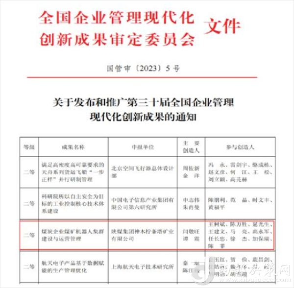 西部決策網(wǎng)訊 近期,全國企業(yè)管理現(xiàn)代化創(chuàng)新成果審定委員會印發(fā)《關(guān)于發(fā)布和推廣第三十屆全國企業(yè)管理現(xiàn)代化創(chuàng)新成果的通知》。檸條塔礦業(yè)公司管理創(chuàng)新成果《煤炭企業(yè)煤礦機(jī)器人集群建設(shè)與運營管理》獲二等獎,是陜煤集團(tuán)所屬煤炭生產(chǎn)企業(yè)唯一一家獲獎單位。