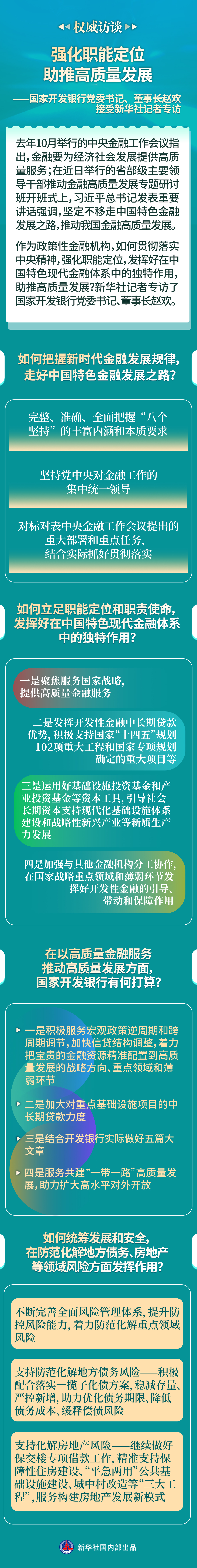 作為政策性金融機(jī)構(gòu),如何貫徹落實中央精神,強(qiáng)化職能定位,發(fā)揮好在中國特色現(xiàn)代金融體系中的獨特作用,助推高質(zhì)量發(fā)展?新華社記者專訪了國家開發(fā)銀行黨委書記、董事長趙歡。