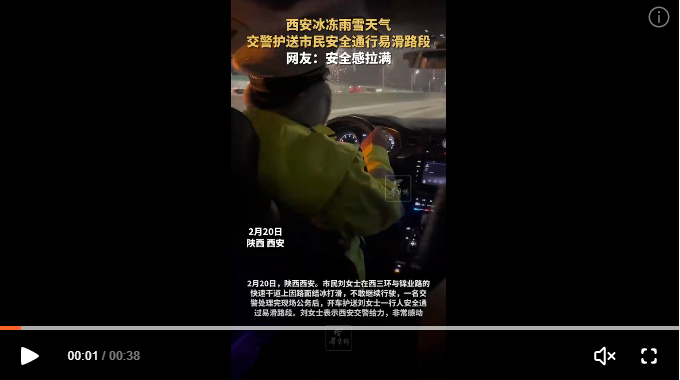 西安冰凍雨雪天氣交警護送市民 網(wǎng)友:安全感拉滿