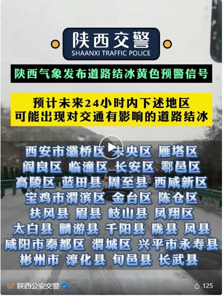 預(yù)計未來24小時內(nèi)下述地區(qū)可能出現(xiàn)對交通有影響的道路結(jié)冰:西安市灞橋區(qū)、未央?yún)^(qū)、雁塔區(qū)、閻良區(qū)、臨潼區(qū)、長安區(qū)、鄠邑區(qū)、高陵區(qū)、藍(lán)田縣、周至縣、西咸新區(qū),寶雞市渭濱區(qū)、金臺區(qū)、陳倉區(qū)、扶風(fēng)縣、眉縣、岐山縣、鳳翔區(qū)、太白縣、麟游縣、千陽縣、隴縣、鳳縣,咸陽市秦都區(qū)、渭城區(qū)、興平市、武功縣、三原縣、涇陽縣、禮泉縣、乾縣、永壽縣、彬州市、淳化縣、旬邑縣、長武縣,銅川市王益區(qū)、印臺區(qū)、耀州區(qū)、宜君縣,渭南市臨渭區(qū)、華陰市、華州區(qū)、潼關(guān)縣、大荔縣、澄城縣、合陽縣、蒲城縣、富平縣、白水縣,延安市寶塔區(qū)、安塞區(qū)、黃陵縣、黃龍縣、宜川縣、洛川縣、富縣、甘泉縣、吳起縣、志丹縣、子長市、延川縣、延長縣,榆林市榆陽區(qū)、橫山區(qū)、神木市、府谷縣、定邊縣、靖邊縣、綏德縣、米脂縣、佳縣、吳堡縣、清澗縣、子洲縣,漢中市南鄭區(qū)、城固縣、洋縣、勉縣、西鄉(xiāng)縣、略陽縣、鎮(zhèn)巴縣、寧強縣、留壩縣、佛坪縣,安康市漢濱區(qū)、漢陰縣、石泉縣、寧陜縣、紫陽縣、嵐皋縣、平利縣、鎮(zhèn)坪縣、旬陽市、白河縣,商洛市商州區(qū)、洛南縣、山陽縣、鎮(zhèn)安縣、丹鳳縣、商南縣、柞水縣,楊凌示范區(qū)楊陵區(qū),韓城市,請注意防范。