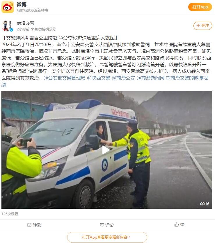2024年2月21日7時56分,商洛市公安局交警支隊西鎮(zhèn)中隊接到求助警情:柞水中醫(yī)院有危重病人急需轉(zhuǎn)西京醫(yī)院救治,情況非常危急。此時商洛全市出現(xiàn)冰雪惡劣天氣,境內(nèi)高速公路路面積雪嚴(yán)重,能見度低,部分路面已經(jīng)結(jié)冰,部分路段封閉通行。執(zhí)勤民警立即與西安高交和路政取得聯(lián)系,同時聯(lián)系西京醫(yī)院做好應(yīng)急準(zhǔn)備。為使病人盡快得到救治,民警駕駛警車警燈閃爍鳴笛開道,以最快速度開辟一條“綠色通道”快速通行,安全護(hù)送其前往醫(yī)院,經(jīng)過商洛、西安兩地高交接力護(hù)送,病人成功轉(zhuǎn)入西京醫(yī)院得到有效救治。