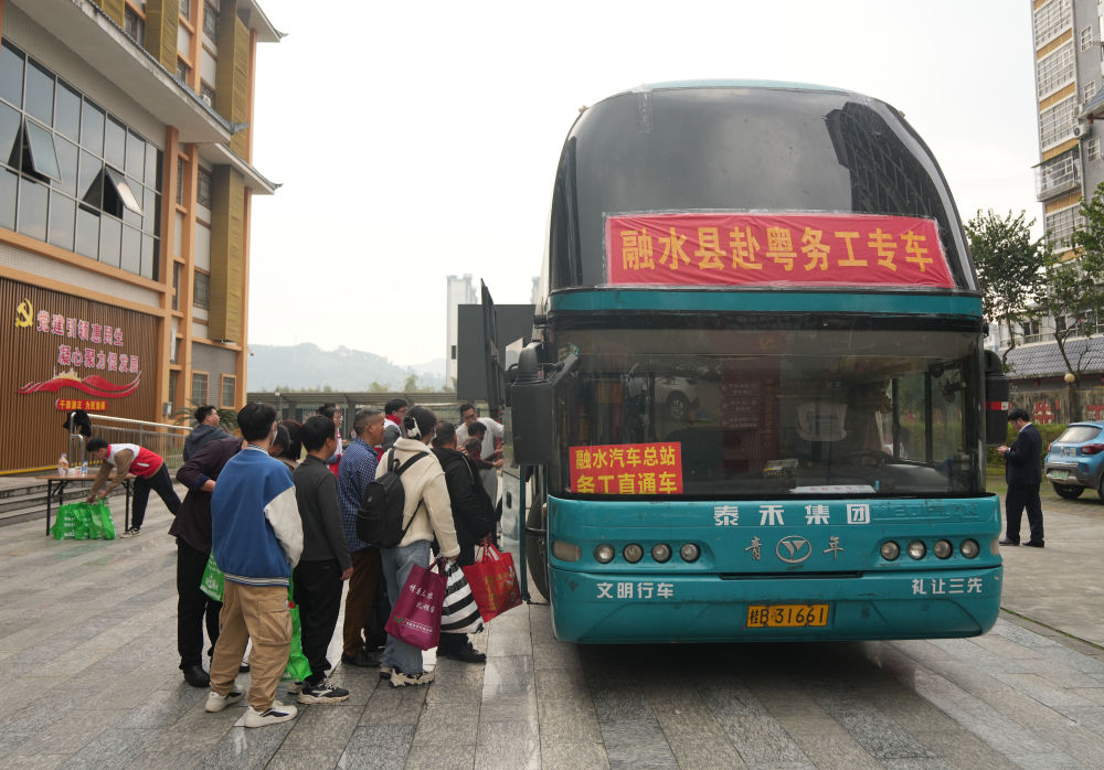 2月21日,廣西柳州市融水苗族自治縣務工人員乘坐赴粵專車返崗工作。新華社記者 黃孝邦 攝
