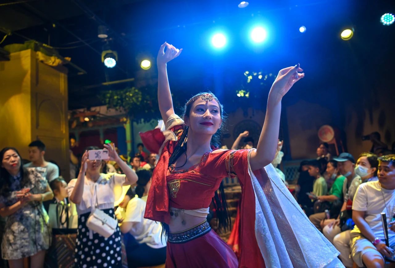 游客在長安十二時辰主題街區(qū)觀看唐風(fēng)演藝《胡姬酒肆》鄒競一 攝