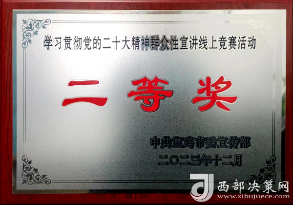 西部決策網(wǎng)訊 2月29日上午,寶雞市宣傳部長(zhǎng)會(huì)議召開。會(huì)上通報(bào)表彰了2023年度縣(區(qū))宣傳思想文化工作考評(píng)結(jié)果,中共寶雞市鳳翔區(qū)委宣傳部榮獲2023年度宣傳思想文化工作創(chuàng)新獎(jiǎng)、學(xué)習(xí)貫徹黨的二十大精神群眾性宣講線上競(jìng)賽活動(dòng)二等獎(jiǎng)!