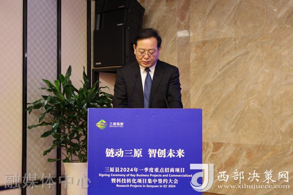 西部決策網訊 近日,“鏈動三原 智創(chuàng)未來”三原縣2024年一季度重點招商項目暨科技轉化項目集中簽約大會在咸陽市舉行。省市領導汪文展、李曉靜、吳進武、仝保亞、王春霄、程文杰、曾亞龍等出席活動??h委書記趙俊強致辭??h委副書記、縣長楊紅剛主持??h委常委、常務副縣長蒙小衛(wèi)等介紹簽約項目情況。投資企業(yè)、項目單位負責人等100余人出席活動。